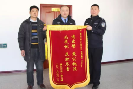 | 2019年3月1日,肇東市民李云峰來到市交警大隊,將一面寫有“速出警秉公執法,為民憂盡職盡責”的錦旗送給了黃慧斌和劉偉剛兩位警官,感謝他們不辭辛苦連續工作,還原... |