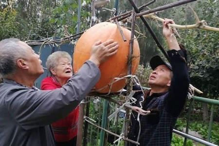 | 日前,黑龍江省綏化市肇東市80歲高齡的趙瑞琴老人,在自家的小菜園里收獲了一個50斤重的大南瓜。 收獲時,左鄰右舍都來幫老人摘瓜。兩個中年人費好大勁兒,才將這個“... |