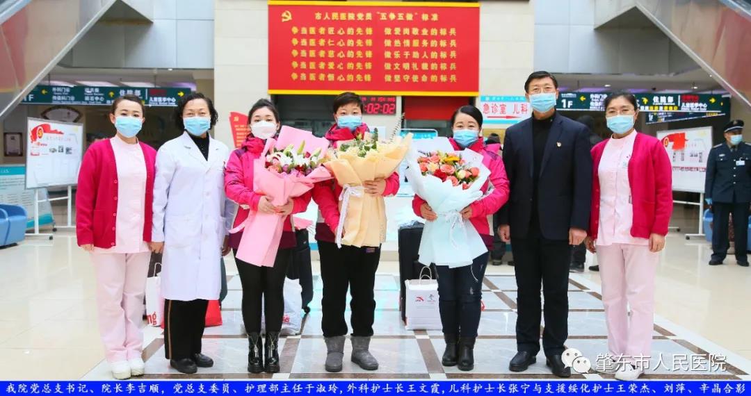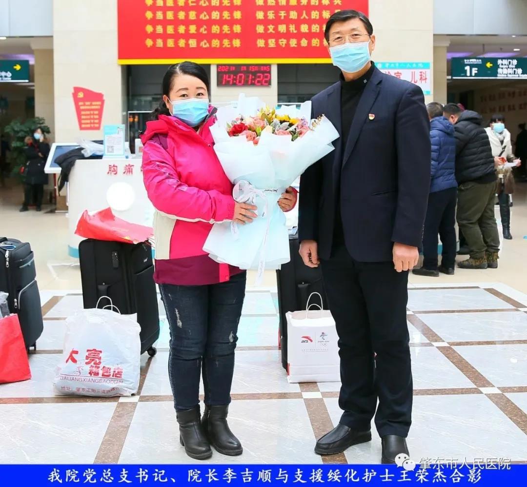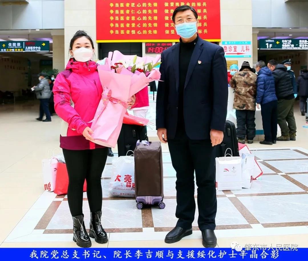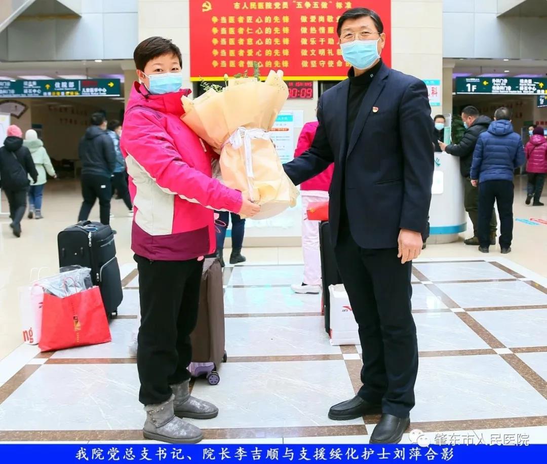 此次趕赴綏化,是我院繼趙志剛、溫明馳援湖北,欒宏偉、趙虹琪、劉文宇支援綏化后的再次出征。出發(fā)前,我院在門診大廳舉行了短暫而又莊重的歡送儀式。沒有太多的祝福和掌聲,一切都太過匆匆,大家都太過忙碌,全院醫(yī)務(wù)工作者都各自奮戰(zhàn)在如火如荼的全民抗疫工作當(dāng)中,人民醫(yī)院黨總支書記、院長李吉順,黨總支委員、護(hù)理部主任于淑玲代表全院職工向三名護(hù)理工作者送去鮮花和祝福,希望她們此次出征能夠不負(fù)使命、不負(fù)重托,充分發(fā)揚(yáng)崇高的職業(yè)精神,在工作當(dāng)中服從指揮、服從大局,忠于職守、相互配合,同時(shí)也要注意防寒保暖,做好個(gè)人防護(hù)。并祝愿她們能夠光榮出征,平安履職,勝利凱旋。
