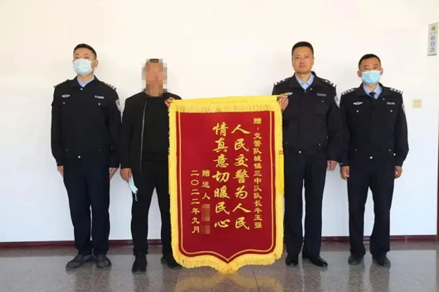 9月中旬,肇東市七道街利民城附近人行道違停三輛翻斗車嚴重影響行人通行,造成一周姓老年人因躲避車輛而摔倒,如果不及時處理可能造成其它嚴重后果。城鎮三中隊得知情況后立即趕到現場,根據具體情況將三輛車托運至停車場,消除了安全隱患,得到周邊群眾一片叫好聲。9月25日,被摔倒老人的兒子為感謝交警,送來一面寫有“人民交警為人民 情真意切暖民心”的錦旗表示感謝!
