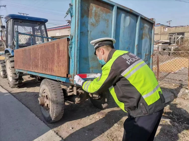 行動(dòng)同時(shí),交警為沒有反光標(biāo)識的農(nóng)用車粘貼了反光貼,對已陳舊、脫落的進(jìn)行查缺補(bǔ)漏,消除盲區(qū)和死角,夯實(shí)“亮尾工程”,為秋收保駕護(hù)航。