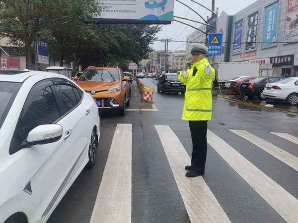 雨中,民警在轄區學校護學崗增派警力,指揮過往車輛,對接送學生的車輛進行快速疏導,護送學生安全過馬路,保障學生上下學交通安全及周邊道路交通安全有序暢通。全體執勤民輔警縱然全身濕透,也沒有一絲怠慢,在各自的崗位上不畏風雨,恪盡職守,全力保障雨天轄區道路安全暢通和廣大群眾的出行安全。