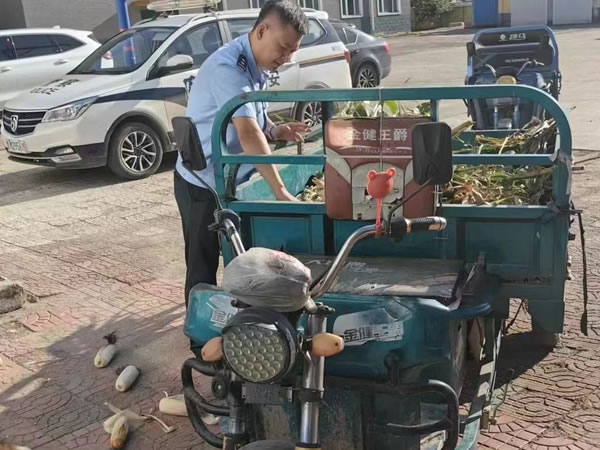 9月14日下午14時(shí)許,海城派出所民警在巡邏到長興村1組一片玉米地時(shí),發(fā)現(xiàn)一臺電動(dòng)三輪車在玉米地邊?浚L興村村民劉某正在往三輪車上裝玉米穗,巡邏民警發(fā)覺事情可疑立即上前詢問,經(jīng)查,劉某交代自己騎三輪車經(jīng)過被盜玉米地時(shí),看到地里的玉米長得很好,想著自己家里的牛正需要飼料吃,于是徒增盜心,就掰了197穗玉米棒裝在車上,準(zhǔn)備帶回家給老牛吃,沒想到還沒裝完就被派出所抓獲。民警看到玉米地里一片狼藉,玉米稈東倒西歪,上面的玉米棒被劉某掰走。玉米是群眾辛勤勞作而得到的勞動(dòng)果實(shí),收獲在望卻被他人偷走,群眾的心情可想而知。