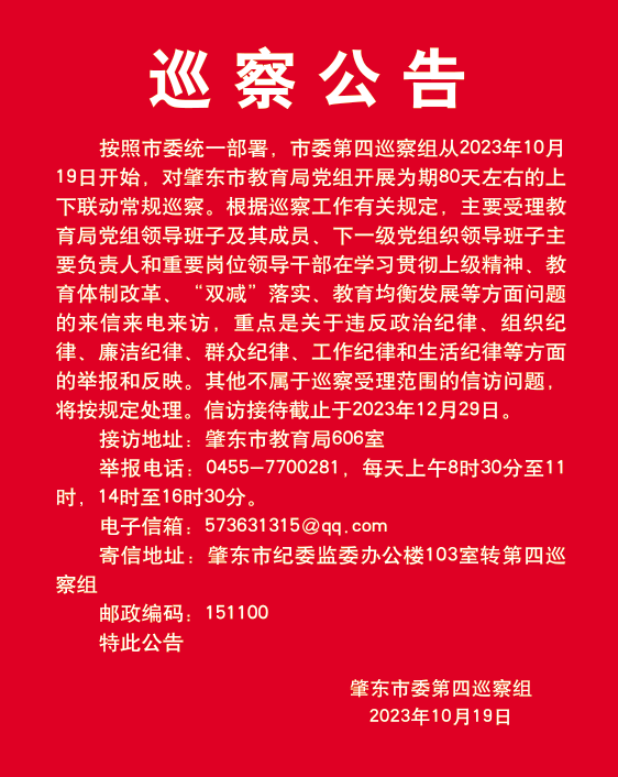2023年10月19日上午,市委第四巡察組對(duì)市教育局黨組巡察工作動(dòng)員會(huì)議在市教育局召開(kāi)。市委巡察工作領(lǐng)導(dǎo)小組成員劉向軍,市委第四巡察組組長(zhǎng)李偉宏出席會(huì)議并講話,對(duì)此次巡察工作的重大意義、目標(biāo)任務(wù)、方法步驟做出了具體要求。
