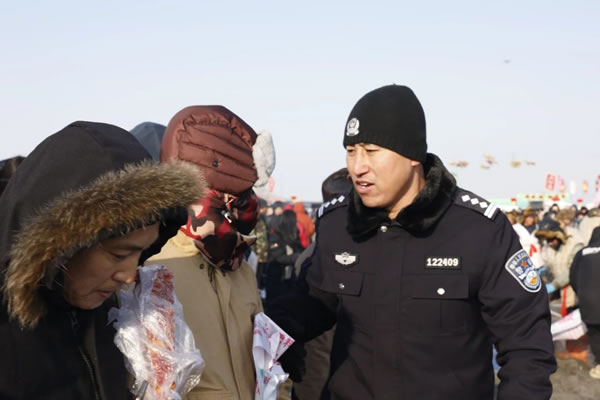 由于捕魚(yú)時(shí)湖面上打下了很多“冰眼”,為了防止群眾距離出魚(yú)口過(guò)近掉入“冰眼”,執(zhí)勤民警合力將“冰眼”守護(hù)起來(lái),疏導(dǎo)圍觀(guān)群眾保持安全距離。執(zhí)勤過(guò)程中,民警們不畏嚴(yán)寒、頑強(qiáng)作戰(zhàn),組織、疏導(dǎo)現(xiàn)場(chǎng)群眾有序觀(guān)看捕魚(yú),有效防止了意外事故的發(fā)生。