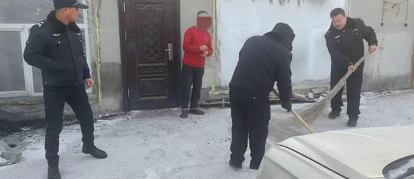 1月23日,天空下起了大雪,正值春雷行動期間,民警下街巡邏,當巡邏至宋站鎮毛先生家門口時,看見毛先生正拿著掃帚準備清掃積雪,由于毛先生患有小兒麻痹,行動不便,巡邏民警立即下車,拿起掃帚和鐵鍬為毛先生掃雪,經過大家的共同努力,不到半個小時便將院內的積雪清掃得干干凈凈。看著整潔的院子毛先生深深地感謝了宋站派出所的民警。