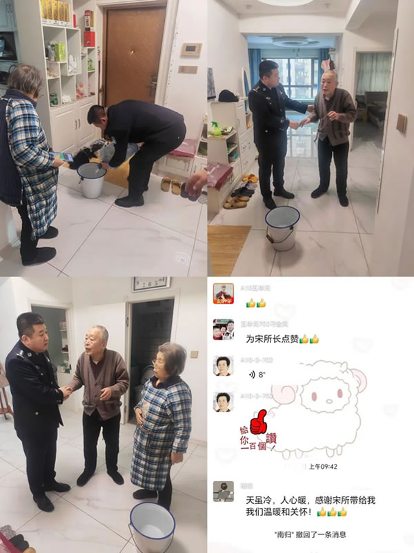 五一假期這天,萬福國際小區(qū)因線路問題,突然停水,A棟3單元的兩位老人剛要做飯,卻發(fā)現(xiàn)停水了,由于年紀大了下樓打水不方便,于是便在網(wǎng)格群里說了一句家里沒有水做不了飯。這一訴求被同在群內的奮斗派出所所長宋艷冬看在眼里,于是不到十分鐘便親自把生活用水送到了兩位老人家中,兩位老人激動地拉著宋所長的手,眼里飽含淚光和感激!