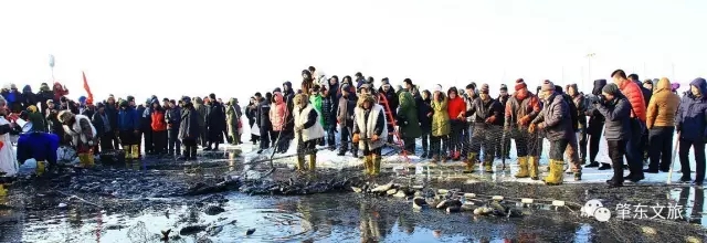 進入冬季,肇東的沿江旅游牌同樣格外吸睛。在澇洲鎮大似海祭湖醒網儀式上,冬捕鑿冰捕魚在充滿薩滿風情的舞蹈中開始了。漁工們將長約800米大網從冰下的一個個鐵鉤子中如穿針引線般穿過后展開,一條條泛著銀光的各類魚兒在水霧間跳躍而出,引起周圍觀眾的陣陣掌聲和吶喊聲的同時,已等候多時的買魚人便迫不及待地開始挑選肥美的大魚了!懊磕甓稌r節,來自省內外的幾千余名旅行者、游客和攝影愛好者聚集在這里,滑冰車、抽冰尜、打雪仗、拉爬犁,大家盡情嬉戲,在領略傳承百年的祭湖醒網和古老捕魚技巧的同時,也感受到大規模冬捕的壯觀和震撼,親身體驗著漁獵文化所獨有的樂趣與魅力”。水產局負責人張益軍這樣告訴記者。