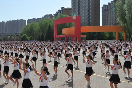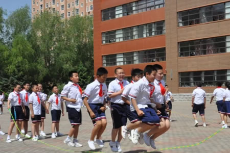“跳繩”是該校體育工作的一大特色,做到了人人有跳繩,個個有花樣、班班有特色。由于此項運動不受年齡限制,是一項強健心臟、有益增高的運動,又能鍛煉學生的彈跳力、節奏感和協調性,非常受學生們歡迎。有長繩和短繩,有速度跳和花樣跳,有單人跳和多人跳,多人集體跳繩等形式,既讓孩子們在跳繩中,展示自我、愉悅身心、享受童年的朝氣蓬勃,更進一步增強了學生集體榮譽感及培養出合作精神。